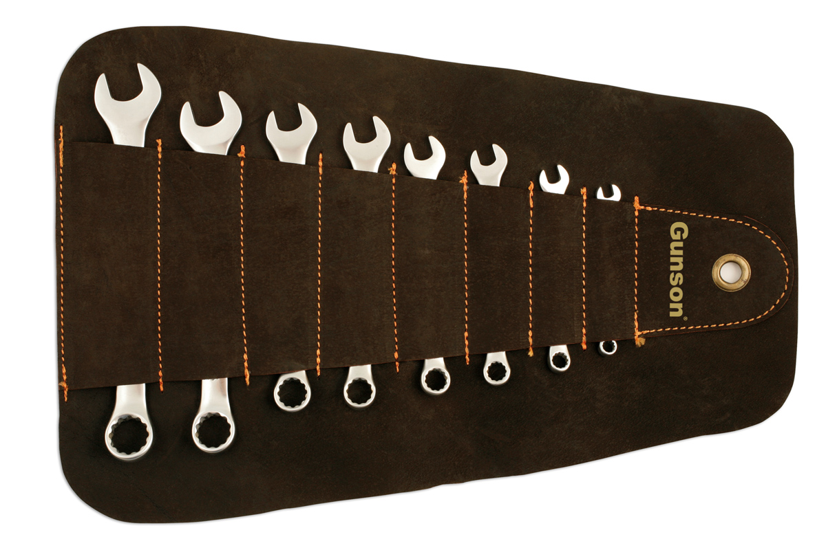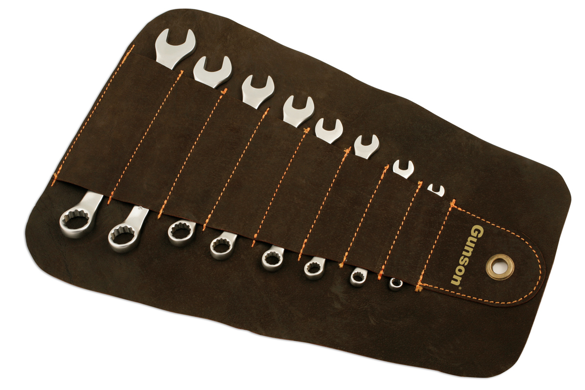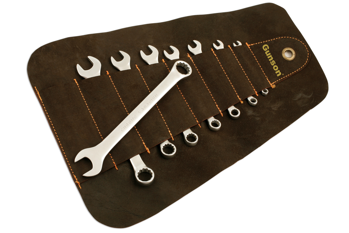 An 8-piece set of Imperial combination Bi-Hex (12-point) spanners, ranging from 1/4" to 3/4". Manufactured from chrome vanadium steel with a satin finish, and supplied in an oiled leather tool roll.